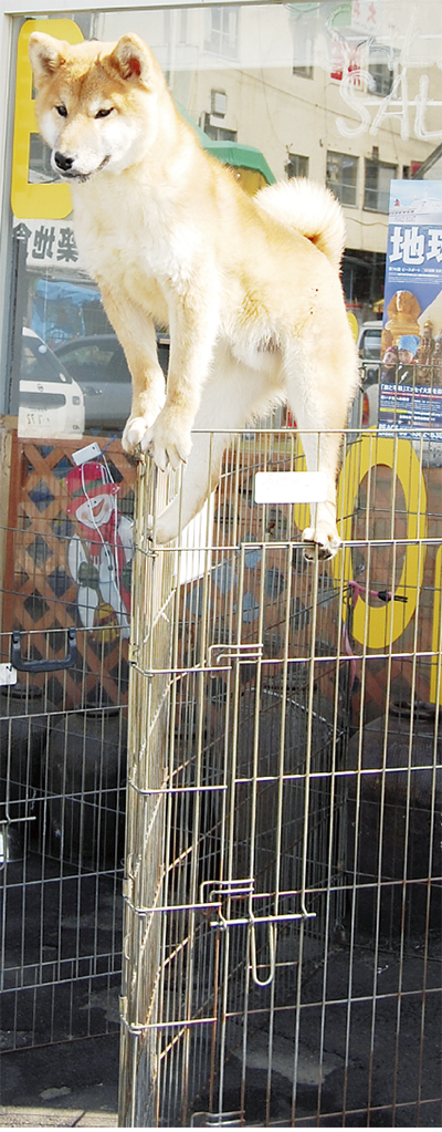 ブリーダー歴35年の熊澤剛店長は「こんなに登ったり飛び降りたりする犬は初めて。テレビに出てから青森や鹿児島からも問合せがくる」と話す。名前は登り降りする姿から、お客さんが『登飛男』と命名したのだという。「気が向いたら登るみたい。5時間くらい柵の上にいたこともある」と熊澤店長。トビオが人気を集めているのを見て最近は隣りの犬も柵を登り始めているのだとか。問合せは【電話】0465(49)3121まで。