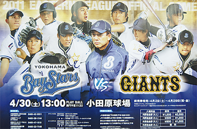 プロ野球イースタン・リーグの公式戦、横浜ベイスターズ対読売ジャイアンツ戦が、小田原球場で開催される。4月30日(土)、午前11時30分開門予定、午後1時試合開始。
