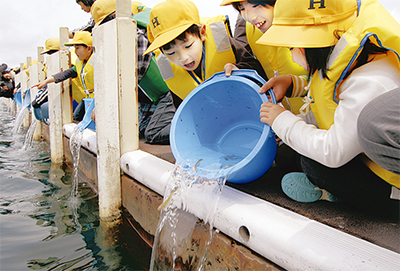 箱根の森小の児童54人が、17日にヒメマスの稚魚2千匹を芦ノ湖に放流した。放流は統合前の箱根小学校時代から受け継がれている入学記念行事。稚魚は体長9cmほどで芦之湖漁業協同組合が今年1月に孵化させたもの。2年後には体長40cm前後に育つ。組合職員は鮭オニギリを取り出し「ヒメマスは鮭の親類で開きにして食べると美味しい。食べたら思い出してね」と紹介。「大きくなれ」の掛け声を合図に、児童がバケツを傾けると稚魚は踊るように水中へ。放流を終えた1年生の駒育実さんは「食べてみたい」と笑顔を見せていた。