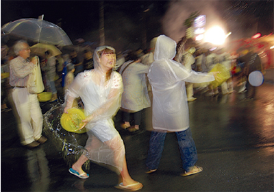 湯河原温泉「湯かけまつり」が先月28日に温泉場で開催された。今年は雨となり女性神輿が中止となったものの、コース沿道に並んだ700個の樽には温泉がなみなみと注がれ、集まった観光客などが桶を手に待機。神輿が観光会館前に到着すると温泉が嵐のように夜空を舞い、「よいしょ」の甚句とともに一帯は白い湯気に包まれた。湯は真横や下から打ち寄せるため雨ガッパは役に立たず、誰もが服のまま入浴した状態に。まつりを主催した湯河原温泉観光協会の高知尾朝行会長は「震災の影響もあったが五体満足の私たちが失速してはならない。観光地として行事は予定通りやるべきだ」と語った。湯河原温泉ではこれまで陸前高田市民を2泊3日で招く復興支援イベントも開催している。