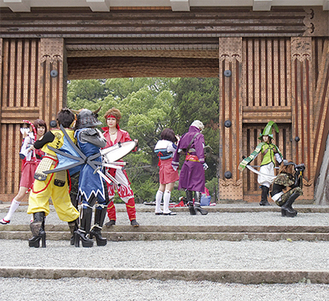 小田原城址公園や報徳二宮神社で3日、色とりどりの衣装をまとった集団がポーズを決めた。毎月恒例となった光景で、コスプレイベント「小田原写真館」の企画。ゲームやアニメの登場人物になりきって撮影を行っている。衣装はほとんどの人が手作り。毎回100人ほどが集まるという。