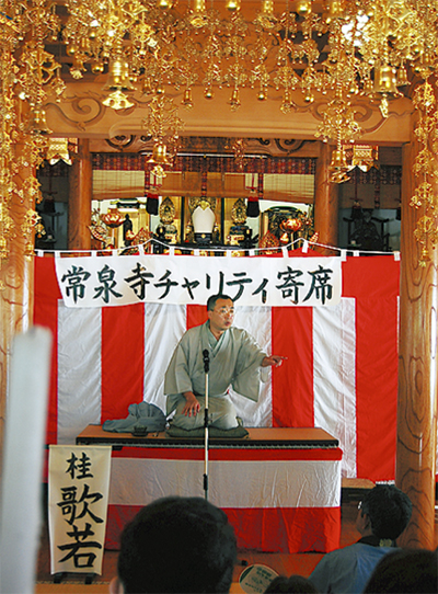 富士屋ホテル近くの曹洞宗常泉寺(折橋尚道住職)で16日、震災復興支援の寄席が開催された。折橋住職が法話の代わりに企画したもので、仏前の高座には桂歌丸一門の歌若さんが登場、ユニークな語り口で来場者を笑顔に変えた。集まった8万5千円は(社)シャンティ国際ボランティア会を通じ被災地支援に役立てられるという。