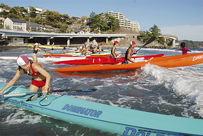 茨城県から静岡県の海岸で活動を続けるライフセービングチーム16チームによるライフセービング大会「海救」が16日に吉浜で開催された。前日までの低気圧が残した波が打ち寄せる会場には逆三角形に筋肉を鍛え上げた大学生など約200人が集合。浜辺から沖を巡る400メートルほどの距離を2メートル以上もあるパドルボードやカヤックを使い全力疾走した。ボードを駆使した複合競技「オーシャンウーマン」では地元湯河原ライフセービングクラブに所属する河崎綾子さんが優勝。「オーシャンマン」クラスでも同クラブ所属の三木翔平さんが1位でゴールラインを駆け抜けた。