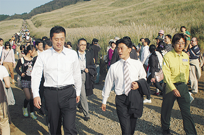 細野大臣 ススキ草原歩く