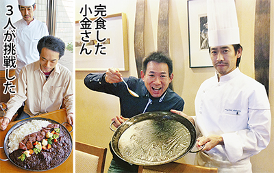 ヒルトン小田原リゾート&スパが食欲の秋にちなんで企画した「5kgカレー」。約1ヵ月間の挑戦期間中に胃袋自慢3名がエントリーし、先月13日に小金信光さん(埼玉県所沢市)が初制覇を遂げた。カレーの大食いは中国で開かれる5〜6kgクラスの大会が有名だが、今回ヒルトンが打ち出したトライアルは4kg分のカレーにステーキを1kg分載せたハイレベルな皿だった。小金さんはストップウォッチを片手にスプーンを動かし25分間で完食(=写真右)。ホテルからは賞品のペア宿泊券が贈られたが、余裕の表情でデザートを食べていたという。