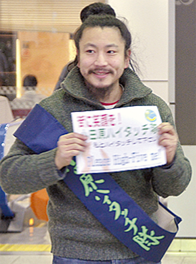 小田原駅構内に15日、「小田原ハイタッチ隊」が現れた。ハイタッチをして街に笑顔と元気を広めるのが狙いだ。市内の学生服店「マルク」が寄付した襷をかけ「おはようございます!行ってらっしゃい!」と、朝9時から駅利用者に元気にハイタッチを求めた。発案者は市内在住の彫刻家、ひでひこさん。以前他の地域で行われたハイタッチ隊の話を聞き、試しに祖母とハイタッチをしてみたところ、とても嬉しそうにしていたという。「こんな簡単なことで笑顔が生まれるなんて素晴らしい」と感じ、小田原でハイタッチ隊結成を思い立った。ツイッターなどで参加者を募り、約25人がハイタッチ隊として朝の小田原駅に集合。ひでひこさんは「小田原を元気にすれば、最終的に日本が元気になる。継続していきたい」と意欲を語った。