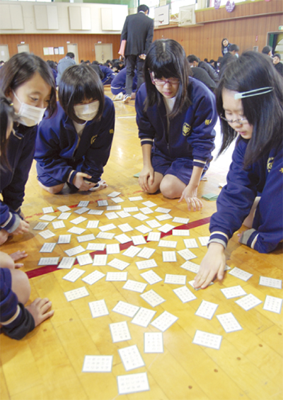 湯河原中学校体育館で19日に百人一首大会が開かれた。参加した2年生228人は読み上げられる短歌を頼りに視線を走らせ、会場内は緊張ムードに。中には上の句を聞いた瞬間にかるたをはじくツワモノの姿もあった。最も枚数を獲得したのは山本彩加さん(78枚)、次いで齋藤心さん(50枚)、鈴木柚衣さん(同)という結果となった。
