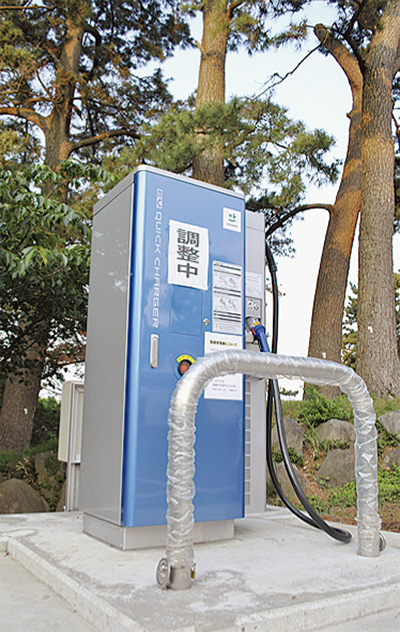 ケープ真鶴の前に新設されたEV(電気自動車)用の充電器が、今週中にも供用スタートの見込みとなった。充電器は町が昨年度500万円ほどで導入したもので、コネクターを車に挿し込めば車種にもよるが30〜40分程度で充電できる。町内ではタクシー会社が充電器を用意しているが官公庁では初の設置。使用料金は無料で、9時から16時まで使えるようになる。