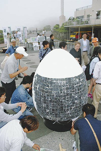 大涌谷名物・黒たまごの殻を使って世界一のサイズの黒たまごを作るイベントが22日に大涌谷観光センターの駐車場で開かれた。