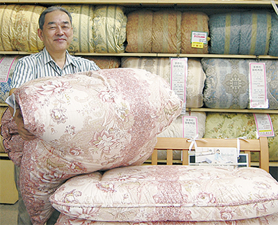 同店の最大の特長は自店で行う羽毛ふとんのリフォーム。「羽毛が片寄っている」「薄くなり温かくなくなった」など、毎日の使用で気になる悩みを石山店長が解決!1枚1枚を店長自ら点検、中羽毛を取り出し必要に応じて洗浄や乾燥消毒も施してくれるので、新品同様ふかふかに生まれ変わる。