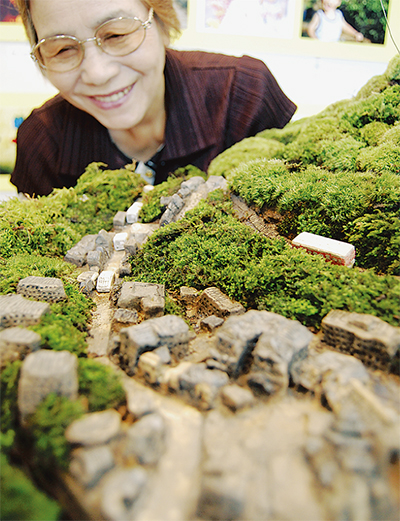 粘土100kgを焼き上げて作った縦横1mほどのジオラマが、富士屋ホテル横のスペース福に登場した。作者は平塚の陶芸作家・岡村友太郎さん(32)。現地調査や地図などを参考にしながらホテルや商店などの建物を形作ったという。こんもりとした仙元山から宮ノ下の国道1号線=写真、堂ヶ島の渓谷を再現し、森は地元の苔が植えられている。低い目線で観ると実際の風景そっくり。イベント「宮ノ下さんぽ」の一環で23日まで展示されている。