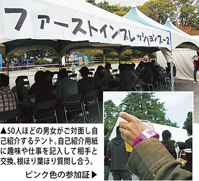 女性が入場するたびに男性陣はさりげなく声を掛けるのだが、みな目が笑っていない。男性参加者は489人、女性349人と男性がやや多めだった。やっと話した相手は偶然にも湯河原と真鶴・熱海に住む女性3人組。「私たちは介護関連の仕事で職場に出会いがないんです」。うんうんと頷き合う女性たち。「真鶴や湯河原でこうした行事があったら行く?」との問いに「地元はムリ」と眉間にしわを寄せた。会場脇に座り込んでいた30歳代の男性も湯河原町民だった。「普段は配送の仕事です。出会いのチャンスはどこにでもあるはず。単純にもてないから来た」と、耳の痛い事を言う。スラリと長身な彼が携帯のスイッチを入れると、1時間程で語り合ったという女性の連絡先がずらり。本紙記者は…30人以上の女性と話したものの成果なし。お堀を眺め、泡の消えたビールを飲み干した。