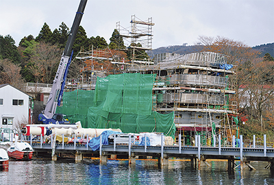 箱根の桃源台で総工費10億円をかけた海賊船の建造が進んでいる。9月から工事が始まり、ユニバーサル造船(株)京浜事業所(鶴見区)から運んだ船体ブロックを組み立てていた。今月に入ってからはシートで覆われ、塗装やマスト設置が進められている。新しい船は18世紀フランスの戦艦がモデル。ユニバーサル造船は海上自衛隊の護衛艦や輸送艦、掃海艦など、本物の艦船も建造してきた。進水式は1月17日で、名前も発表される。入れ替わるように1982年に就航したロワイヤル号は引退する。