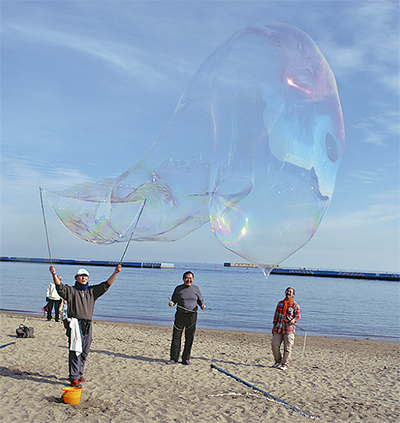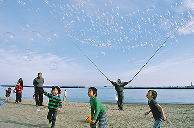 休日、熱海のサンビーチに現れる「シャボン玉名人」が観光客の視線を集めている。釣竿のような2本の棒をバケツに突っ込みおもむろに空にかざすと、海からの風が無数の泡風船を吹かす。泡を割ろうと駆けまわる子ども達を横目に「絶好のシャボン玉日和ですね」。名人は泉地区に住む会社員の大野久夫さん(41)。2年前に市販のシャボン玉で遊んでいた姪っ子を見たのがきっかけだ。より多く、大きな玉を作ろうとインターネットを辿り、国内外の名人の技を研究するようになった。最初は見よう見真似だったが次第に自分流に道具をアレンジ。両手に握る棒の間には凧糸の輪がいくつも連なり、泡を生む。素材にこだわって京都の専門店から糸を取り寄せることも。シャボン液は粘度のある洗剤などをブレンドしたものだ。大きな玉を作るためには、湿度も重要だが割れる原因になる液の泡をこまめに取り除くことが肝心だという。最近、大人と子どもが一緒になって遊ぶことを目指すボランティア団体「熱海ビーチクラブ」に加わり、毎月第二日曜日に浜辺に立つようになった。「最初は自分が楽しかったけど、今は観光客や地元の人が喜ぶ姿を見るのはもっと楽しい。首都圏でも飛ばしたい」と話していた。