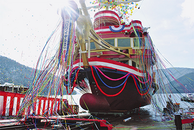 6代目となる箱根観光船の新造船(長さ35m・定員565人)が、17日に桃源台で進水式を迎え、赤い船体が支綱(しこう)カットとともに水面へと動いていった。18世紀にフランス艦隊の旗艦として活躍したフランスの軍艦「ロワイヤル・ルイ」をモデルにしたデザインで、建造費は約10億円。自衛隊の護衛艦や輸送艦なども手掛けるジャパンマリンユナイテッド(株)(本社・東京都港区)が昨年9月から箱根桃源台で工事を進めていた。命名は「ロワイヤルII」。船長はビクトリー号の船長も務めた室伏岳文さん(39歳・町内在住)が就任した。進水後は内装工事や試験を行い、3月20日の就航に向けて準備を進める。特別船室内部は中世フランスの宮殿風に仕上げ、船員の人形や舵輪、トリックアートなどを配置、撮影ポイントを盛りこむ。渡辺浩司社長は「また乗りたい海賊船、がコンセプトです。感動を味わってほしい」と話していた。