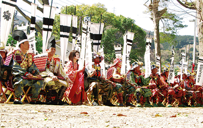 湯河原を領地とした豪族・土肥実平が源頼朝とともに挙兵した歴史にちなんだ「土肥祭武者パレード」が4月7日に湯河原の町を練り歩く。五所神社で午前10時から武将の名乗りや出陣の儀、焼亡の舞などが披露された後、11時に「出陣」。かつて実平の館が広がっていたとされる湯河原駅を目指し御所車や七騎武者、土肥一族の荒武者などが続く。11時30分から湯河原駅構内で武者の名乗りなどが行われた後、城願寺で土肥実平・頼朝主従法要や墓参などを行う。頼朝役は冨田幸宏町長(騎馬)、実平役(騎馬)を町議の村瀬公大氏が務める。北条政子に扮するのは湯河原町子ども会育成団体連絡協議会の加藤香さん、実平の妻は同会の常盤文代さんが務める。