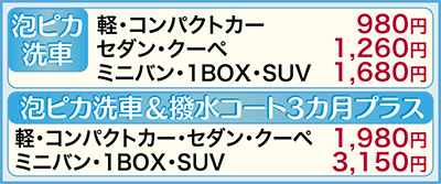 この「泡ピカ洗車」は、機械で洗うのではなく、プロによる優しくていねいな手洗い洗車。さらに、美しい光沢が約3カ月も保てるという撥水コートをプラスすればもう完璧(表参照・全て税込)。