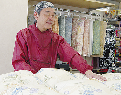 「羽毛の吹き出しや偏りがあったらリフォームが必要です」と話すのは石山店長。一枚一枚自ら加工を手がける、布団のプロフェッショナルだ。必要に応じて羽毛の消毒や殺菌を行い「本当に同じ布団?」と驚くほどふっくらと暖かに仕立ててくれる。手に取って選べる側生地は50種以上。「できるだけ軽く」など要望も取り入れて新品同様に仕上げる。羽毛原料が品薄になり価格が高騰しているとあり「今お使いの布団をリフォームしながら使うのがオススメ」と石山店長は話す。
