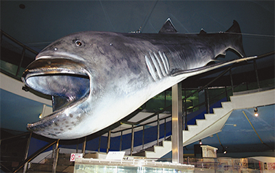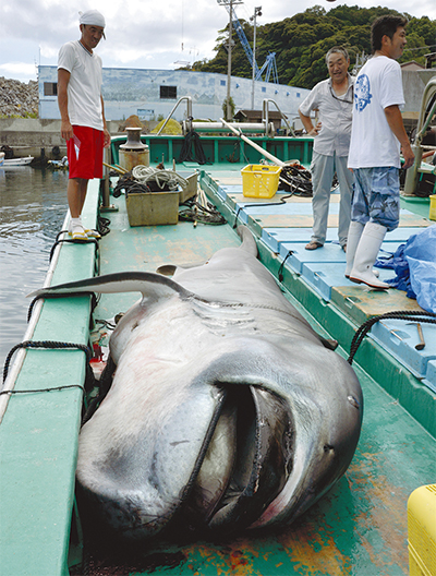 真鶴半島沖の定置網で、先月3日に希少種のメガマウスザメ(雌)が見つかっていた事が分かった。真鶴漁協に所属する漁船・第5あしがらの船員が水深45mの網で発見したもので、尻尾を吊り上げようとしたところ、重さでちぎれてしまったという。長さは5・77mあり、国内では最大級。メガマウスはその名の通り巨大な口が特徴で、大量のプランクトンを海水ごと吸い込み、エラで漉しとって食べている。70年代にハワイで初めて確認されて以来、国内では15例しか見つかっていなかった珍種だが、真鶴周辺では7年前に福浦の定置網で見つかり(長さ5・68m)、2年前には岩の新島沖にある定置網で幼いメガマウスが捕獲(3・7m)されるなど出現頻度が高い。国内で見つかるのは不思議と雌が多く、その理由も分かっていない。生命の星地球博物館の瀬能宏さんは「4〜9月に相模湾にやって来るようだ。もっと小さなサメが見つかれば繁殖地なども分かるかもしれない」と話す。今回のメガマウスは解体されたが子宮の中に卵はなく、両あごや組織片が標本として同博物館に収められた。