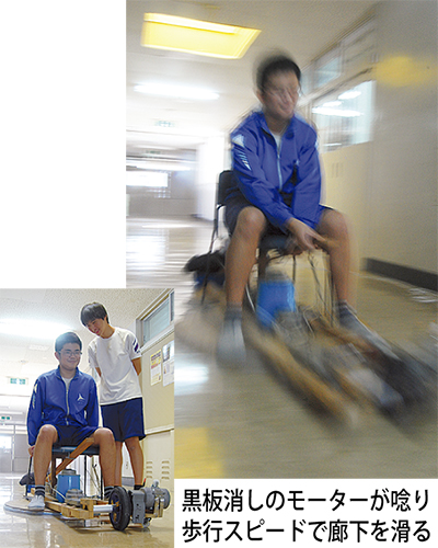 製作のきっかけは顧問・林川玉輝さんの「作ってみないか」という一言。材料はCDケースや菓子の包装材など身近な品々を持ち寄った。掃除機のモーターを動力に使っていたが故障と修理の連続に悩まされ、黒板消しからモーターを取り出して使っている。車体は浮いたが、駆動輪を床に接地させなければ前に進んでくれない。そこで重りに選んだのが地元名産の「小松石」。前後に積むと丁度良い浮き具合になった。