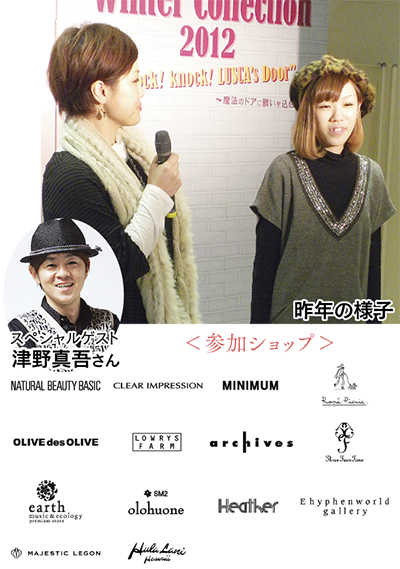 人気ブランド14店のショップスタッフ・顧客がモデルを務め冬のおすすめコーディネートを紹介する。スペシャルゲストはテレビや雑誌で活躍中のスタイリスト・津野真吾さん。抽選券付観覧チケット持参で、披露されたファッションアイテムが28人に当たるプレゼント抽選会に参加できる。チケットは飲食・食品を除く税込3千円以上のレシートと引き換え(先着50人)。最新アイテムをゲットするチャンスをお見逃しなく!