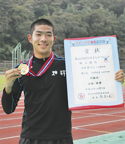 相洋高校陸上部(銭谷満顧問)の古谷拓夢君(2年=写真)が、10月7日に行われた国民体育大会の陸上競技少年男子A110m障害で、大会タイ記録の14秒03をマークし、優勝した。同18日に行われた日本ユース陸上競技選手権大会でも同種目で優勝し、インターハイ(IH)・国体と合わせ「高校3冠」を達成した。