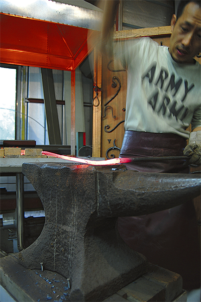 湯河原の地名でもおなじみの「鍛冶屋」が鉄のブドウやバラなどユニークな鉄の装飾品を生み出している。住宅の門扉や壁などを飾る「ロートアイアン」というジャンルで、アールヌーヴォー様式を思わせるデザインが持ち味だ。上原すすむさん(41歳・宮上在住)は20年ほど前に家業のステンレスなどの建築部材の製造や加工を継いだ。1ミリ以下の精度を問われる世界で腕を磨いていたが、ある日精度を気にせず自由に形作る工芸の世界を知り、3年前から自作を始めた。コークス(石炭由来の燃料)をくべた炉は自作したもの。炎に鉄を突っ込むと数分で加熱して輝く。これを叩いて生まれた波紋や、粘土のような捻じれ模様などは手作りならでは。上原さんは「叩いているとストレス発散になる。もっとこの世にないモノを作りたい」と汗をにじませていた。