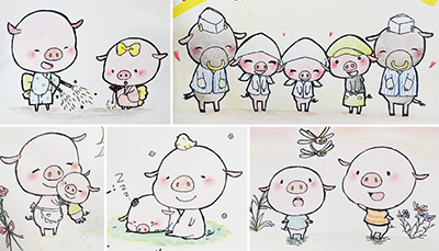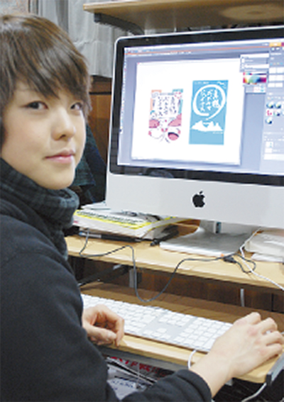 真鶴のおおみちジョイナス商店会で13日に特注の「暖簾」が完成する。長さ1・5mほどの新作をデザインしたのは商店街の「肉の石川」で働く松田幸恵さん(25)。手描きした絵をパソコンに取り込んで処理したという。相洋高校在学中から友人を主人公に見立てて漫画を描き始め、桜美林大で専門的なデザインを学んだ。肉の石川に入ると壁やドアで松田さんデザインの豚キャラクター=写真上が出迎えてくれる。松田さんは「のれんを見た人が絵のように和やかに明るくなってほしい」と話していた。