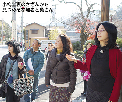 湯河原出身の女流俳人・黛まどかさんが7日、湯河原文学賞の表彰のため郷里に帰り、参加者と温泉場散策を楽しんだ。黛さんは観光ガイドさながらの説明と引率で光風荘や伊豆屋、上野屋などの由緒ある建物を案内。一行は時折立ち止まりながら投句のアイデアを手帳に記していた。