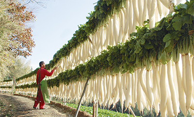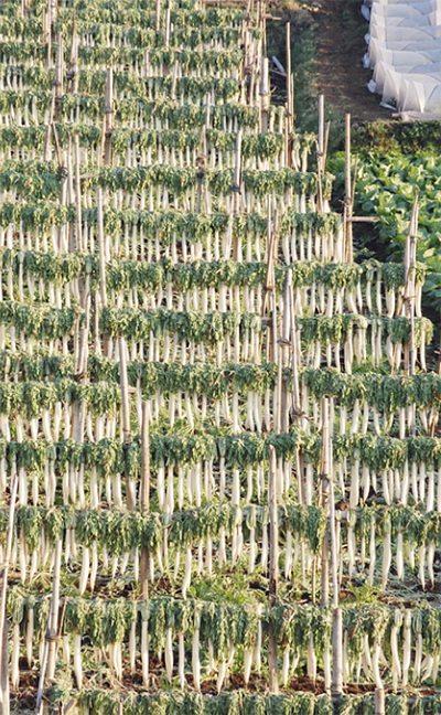 大根は10日間ほど乾燥させた後にぬか漬けにされる。箱根西麓一帯は火山灰で水はけが良く根菜の栽培に最適という。凍結しない程度の寒さが干し頃だ。昔の農家は夜に焚火で温め気を使ったという。毎年農道沿いに約2千本の大根を吊るす今井寿さん(55)は「農家一軒ごとに味が違う。夫婦でも味が変わる。三島に来て好みのたくあんを探して欲しいね」と話していた。