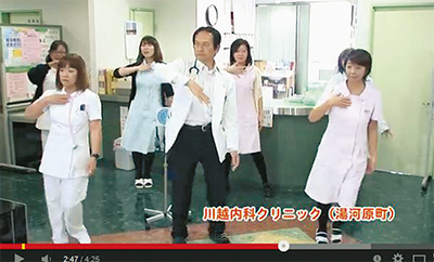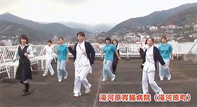 湯河原町などの医師や看護師が、アイドルグループAKB48の曲「恋するフォーチュンクッキー」に合わせたダンス動画をネット上で公開した。「恋する〜」のダンス動画は黒岩知事などが参加した神奈川県バージョンもあり、300万回以上再生されるなど話題になった。小田原医師会では小田原市内の医師が発案し、昨年秋に3か月かけて撮影。のべ400人が踊った。当初は同会の忘年会で流すだけの予定だったが、ネット上にも掲載されることに。動画の冒頭ではまず横田俊一郎会長が登場、「県西の皆さんの健康を守るため日夜研鑽し、親睦を深めている。団結力を見てほしい」とあいさつ。音楽に合わせて小田原や湯河原の医療機関を舞台にダンスが繰り広げられる。湯河原胃腸病院=写真下では、検査技師や看護師などが屋上でぶっつけ本番で撮影したという。湯河原の川越内科クリニック(土肥)では待合室で踊りを披露。踊りは初めてだったという川越三洋院長は「医師会というと敷居が高いイメージがありますが、親しみを持ってもらえたのでは」。動画はインターネットの「ユーチューブ」で「小田原医師会」を検索すると見られる。