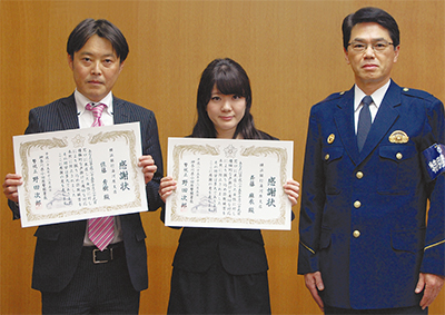 横浜銀行湯河原支店(土肥)の佐藤秀樹課長と斉藤麻衣さんに先月5日、小田原署から振り込め詐欺防止の感謝状が贈られた。
