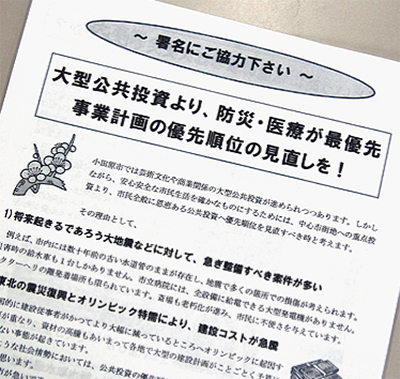 署名活動は「住みよい小田原を考える会」が1月25日から行っている。署名は「再開発やセンターなど建設を急ぐ大型公共施設の計画を見直し、市民生活の安心安全の確保に優先度を付けること」を要望。センターと駐車場棟の建設費・約100億円を、公共施設の修繕・更新や市立病院の自家発電などに優先的にまわすことを求めている。
