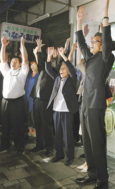 熱海市長選の投開票が7日に行われた。有権者数は3万3682人、投票率は59・41%。現職の斉藤栄氏(51)=右端が1万1131票を獲得、前観光協会会長の森田金清氏や元市議の田中秀宝氏に4千票以上の差をつけて圧勝、3期目を決めた。斉藤氏は当選後に「静岡側は伊豆半島でまとまりがちだが、熱海は境界。箱根・湯河原と同じ圏域にあって、それぞれ特色があると思う。熱海には新幹線の駅もある。五輪に向けて連携を深めたい」と語った。