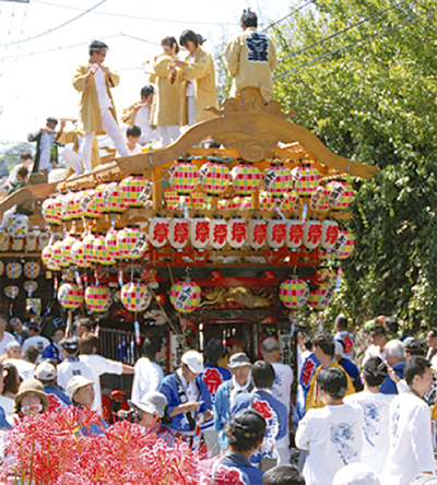 五穀豊穣や家内安全などを願うこのまつり。神の道案内役である猿田彦を先頭に宮本(曽我谷津)・原・別所・上曽我・岸地区の5台の山車と、神戸(ごうど)の神輿が宮入り(午前11時頃)する。1台の山車に高砂人形を飾り、お囃子と寿獅子舞を奉納した後、山車と神輿は下曽我駅前(午後2時半頃)に集合する。