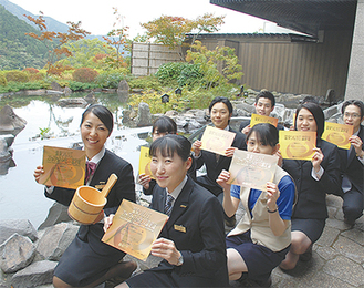 エクシブ箱根離宮が国内で最も「温泉ソムリエ」が在籍するホテルになった。この肩書は「温泉の正しい知識」と「正しい入浴法」を習得した人を認定する民間資格で、ホテルが開業した5年ほど前にスタッフたちが「温泉地で働くなら資格を取ろう」と発起。それから毎年のように新潟県の赤倉温泉で研修を受け、資格保持者は総勢22人に増えた。箱根離宮の温泉は2種類の泉質があり、かけ湯や入浴の順序などのアドバイスに役立っているという。ソムリエの一人、大熊かおりさん(38)は「他の施設に入浴に行ったり、分析表を見たり、自分自身温泉を楽しめるようになった」と話す。箱根離宮では12月8日に温泉ソムリエの「家元」遠間和広氏を招き、資格が取れるセミナーを開く予定。