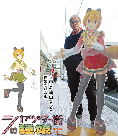 キャラクターを思いついたのは商店街の企画メンバー・横山裕介さん(45)の発想だった。「箱根にはエヴァのファンが来ているが、湯河原にはアニメがない。それなら自分たちで作ろう、と」。アニメ関連のイベントに行ってみると、コスプレを楽しむ人々やファン同士が交流で盛り上がる光景があった。「ゆるキャラ」とは異なる可能性に着目した横山さんは、デザイナーの境ヶ原まるこ氏(愛知在住)に作画を依頼。推敲を重ねて昨年11月にようやく狸姫の姿がお目見えした。