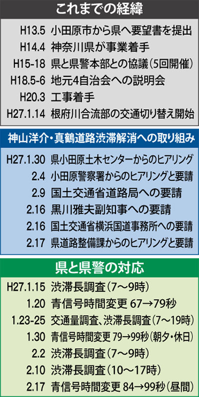 最優先は頻発する渋滞の緩和です。責任所管である県当局(道路整備課・県土木)をはじめ、県警、国土交通省(道路局・横浜国道事務所)等に対し、早期対処の強い要請を行い、打開に向けた協議を重ねてきました。