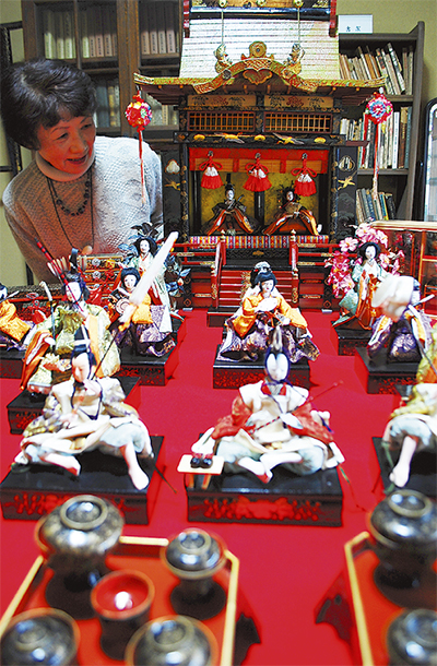 写真=精巧な作りの雛に見入る同館職員