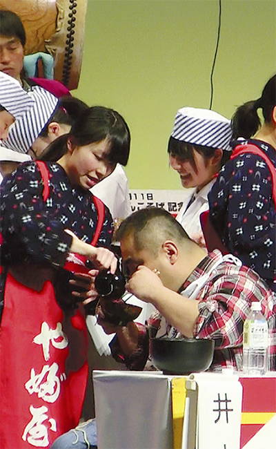 「終盤は苦しかったが、気合と根性で乗り切りました」。岩手県花巻市で2月11日に開催された第57回元祖わんこそば全日本大会で、小田原市在住の井本英明さん(44・会社員)が連覇を果たした。制限時間の5分間に平らげた杯数は219。昨年の226杯には及ばなかったものの、「横綱」の座を守り抜いた。大会後は「そばは消化が早い」と、夕食の天津飯と餃子をしっかり平らげた。8年前に行きつけの店の勧めで、パンケーキやホルモン鍋の大食い大会に初出場。食べた量で決まる単純明快なルールに魅せられ、各地の大会に挑戦し始めた。横浜のわんこそば店に通い、喉の筋力を鍛えるべく、空気を飲み込むトレーニングを続けている。オフの時は湯河原の飲食店を訪れる事もあるらしい。「高松食堂(中央)の坦々焼きそばは美味い」「国味ラーメン(土肥)のチャーシューワンタンメンはボリュームがあってスープも濃厚」と絶賛していた。