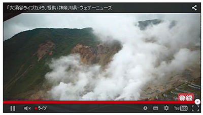 カメラは千葉の気象情報サービス会社、(株)ウェザーニューズが設置管理しているもので、規制区域内の箱根ロープウェイ大涌谷駅に設置。警戒レベルが1に戻るまで中継する。同社と県は4年前に「かながわ減災プロジェクト」に関する協定を結んでいた。大涌谷には県の自然探勝路管理用カメラがあったが、中断などの不具合あった。現在はこの中継カメラのほか、環境省、気象庁が動画や静止画などを配信している。
