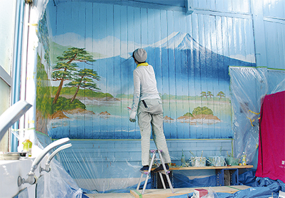 経年劣化で古いペンキが所々めくれあがり、5年程前から塗り替えを検討していたという店主の加藤寛さん(81)。近年は銭湯の減少とともに描き手も少なくなるなか、インターネットを通じてペンキ絵師の田中みずきさんと出会い、塗り替えが実現した。