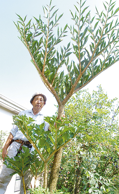 湯河原町吉浜の力石康之さん(72)の畑に高さ2mを超える大型のこんにゃくが育っている。木のようにしか見えないが、触ってみると弾力がある。サトイモの親戚のような植物で、地中の芋を収穫する。自然発生したものを育てるうちに例年とは違う成長ぶりに気付いたという力石さん。「何でかなぁ。70年の人生で初めてだ」。彼岸すぎまで栽培し、奥さんの調理で力石家のおせち料理になる予定。「でも大きすぎると味が薄くなるんだよね」。