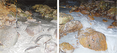 町は週2回ほど大涌沢や合流先の早川(宮城野・湯本)で水質を調べている。透明度は、採取した水を「透視度計」に注ぎ、底に記した「十字」が見える高さを計るもの。8月24日時点で3cm程度まで見通せるようになった。また噴火時には泥水1リットルあたり約10グラムの浮遊物が確認されたが、半月後にはその10分の1程度に減っている。白い濁りは残っているが、温泉地学研究所によると「主に硫黄成分によるもの」。沢が合流する早川では魚が浮くといった事例もなく、河口や相模湾でも「変化は特に確認されていない」(県相模湾試験場)という。