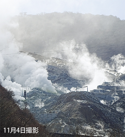 大涌谷の火山が活発化し立ち入り規制が始まってから半年が経った。4日現在、噴火警戒はレベル2で、県道734号線の三叉路からの通行止めが続いている。