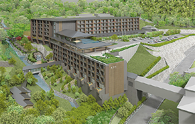 敷地は元々ユネッサンの一部やユネッサンインがあった場所。新施設は地下1階・地上9階建、150の客室や滝を見上げる露天風呂、外輪山の眺望を楽しめる棚湯風呂などを設置する。オープンは来春の予定。