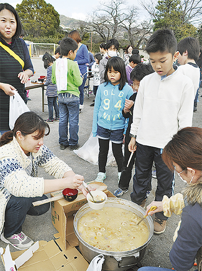 30年以上前から続く行事だが、決まったレシピはない。味付けは酒粕、ごま油を入れたりと地域ごとに様々だ。毎年「あるもので適当に」を合言葉に個性的な芋煮が出来上がるという。今年も例年通り、おかわりの連続に。息を吹きながら芋を食べる子を前に、母親たちは「晩御飯の分まで食べていいからね」と笑顔。鍋はまもなく底をついた。