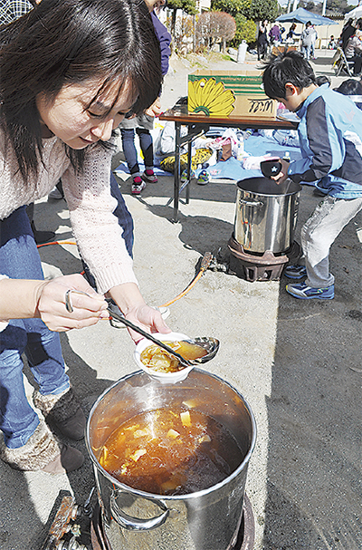 体育館では湯河原中学校科学部のメンバーがサイエンス劇を上演。ペットボトルロケットで悪の科学者を追い払う物語で、100人ほどの子供たちを惹きつけた。グラウンドでは5地区の保護者たちがそれぞれ「芋煮」を準備した。