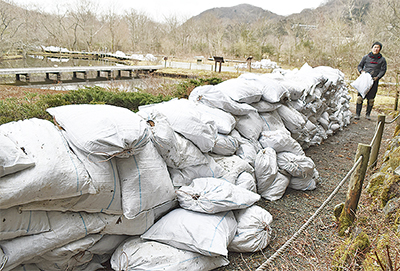 仙石原の箱根湿生花園で22日に枯葉袋の撤去が行われた。園内に生えるショウジョウバカマなどの芽を寒さから守るため11月下旬からかぶせていた約5千袋で、中には園内や別荘などから集められた枯葉がぎっしり詰まっている。冬はマイナス10度ほどまで下がるが、この「布団」をかぶせる事で凍結を防げるという。同園は3月20日にオープンする予定で、名物のミズバショウも見頃を迎える。