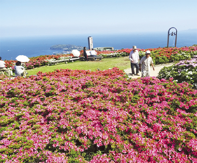 相模湾の絶景を前に約5万株のさつきが5月下旬から順々に見頃を迎える。28日からは地場産品の販売コーナーが設けられ、湯河原駅から臨時バスも運行。